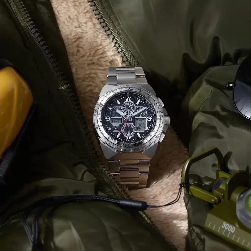یکی از جذاب ترین مدل های هوانوردی سیتیزن طراحی و ساخته شده برای تیم آکروجت هوایی ایالات متحده در این مدل شما یکی از بالاترین پتانسیل های شارژ سولار را در اختیار خواهید داشت و ساعت شما توانایی نگهداری شارژ تا ۳/۵ را دارا می باشد به علاوه بزل گردان ساعت با دقت بسیار بالا امکان محاسبات هوانوردی را در اختیار شما قرار می دهد سیستم رادیو کنترل به کار رفته در این ساعت با برقراری ارتباط با امواج رادیویی قرار گرفته در کشورهای اروپای غربی امریکای شمالی چین و ژاپن ساعت شما را به صورت خودکار تنظیم می نماید