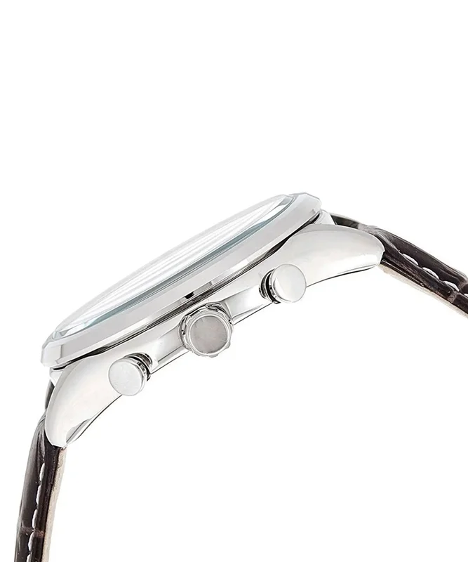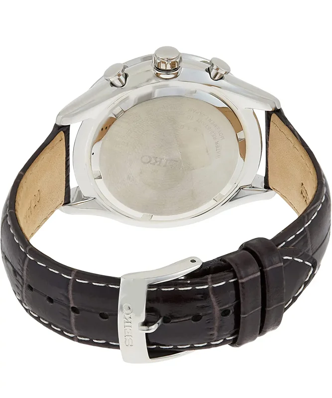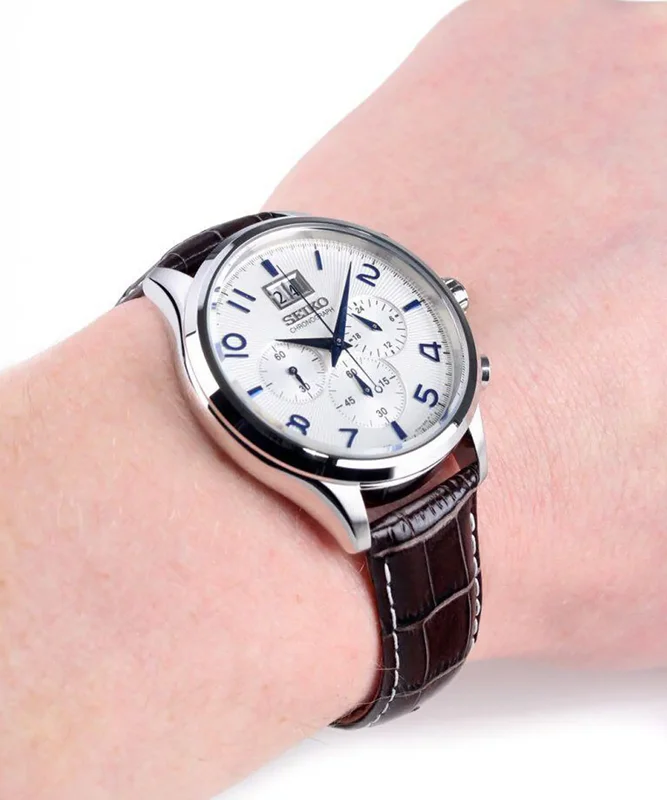 ساعت مچی مردانه سیکو seiko با طراحی روزانه بند چرمی و قاب استیل با صفحه سفید و موتور ژاپنی با انرژی باتری و قابلیت داشتن تقویم ,روز و شب , کرنوگراف و مقاومت در برابر آب تا عمق 100 متر به همراه دو سال گارانتی بین المللی