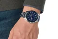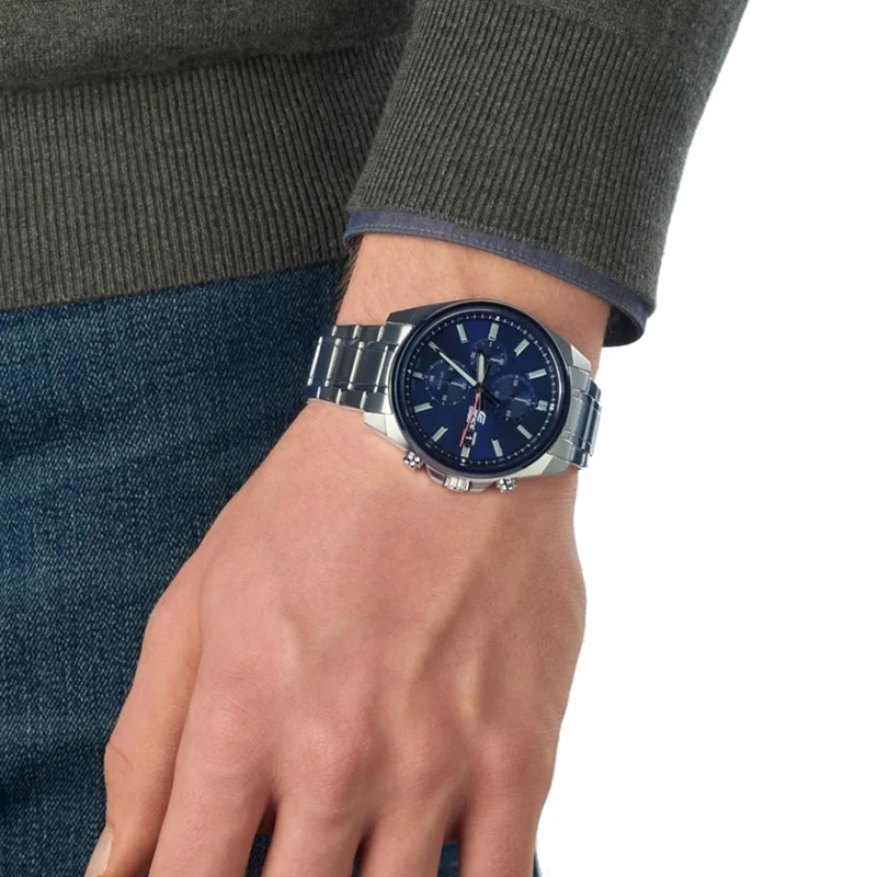 این ساعت دارای طراحی کلاسیک و شیک است که با رنگ نقرهای و صفحه سرمهای، ظاهری جذاب و مردانه به آن بخشیده است. صفحه نمایش آن دارای سه عقربه و سه زیرصفحه است که به زیبایی و کارایی آن افزودهاند.